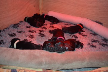 Het nestje bestaat uit 6 teven en 2 reuen. Ze zijn allemaal zwart. De geboortegewichten lopen vrij ver uiteen. Maar zoals het er nu uitziet gaat het allemaal prima. Ze drinken goed en Verona is weer een op en top moeder. Ze poetst ze dat het een lieve lust is en houdt ze het liefst zo dicht mogelijk bij haar.